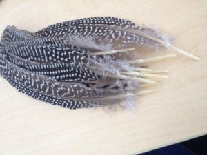 These natural wing feathers are from the Guinea Fowl,They are a stiff feather as opposed to the soft body feathers,the feathers are multi functional.They are 6-8 inches in length.
